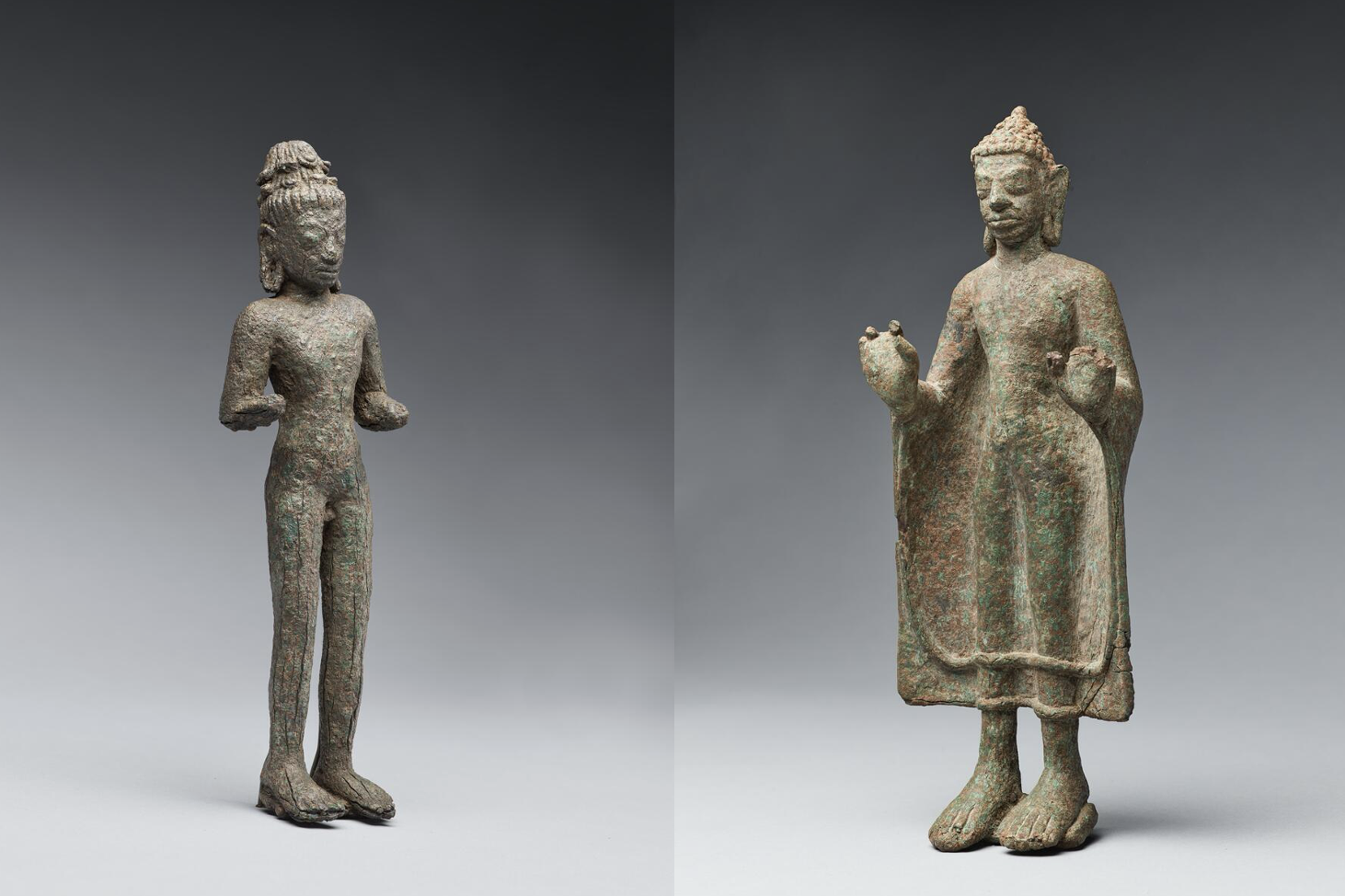 The four bronze sculptures featured in Moving Objects were acquired by the museum between 1965 and 1968 and have been linked to the Khmer temple complex Prasat Hin Khao Plai Bat II, located in northeastern Thailand. Likely created between the 7th and 9th centuries, the sculptures depict Buddhist deities and were part of a larger collection of artifacts discovered near Prasat Hin Khao Plai Bat II in the 1960s. Thai scholars and local advocates have worked tirelessly to uncover the networks that removed these bronzes; evidence suggests that the temple site was systematically looted, with the statues then being sold into international art markets. This scholarship and an investigation by U.S. authorities laid the groundwork for a formal repatriation request from the Fine Arts Department of Thailand.